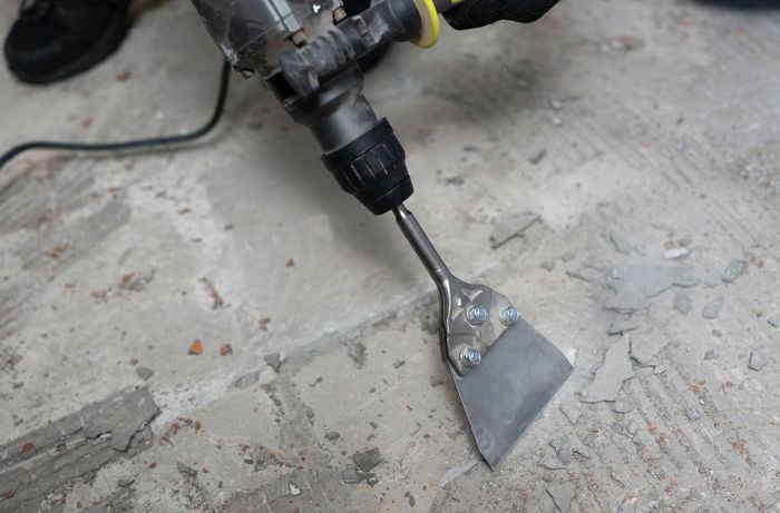 망치, 끌 비트가 있는 로터리 해머 드릴, 절단할 실리콘이 있는 경우 다용도 칼이 필요합니다. 스크레이퍼는 타일 아래의 접착제를 제거하기 어려운 경우에도 유용할 수 있습니다.