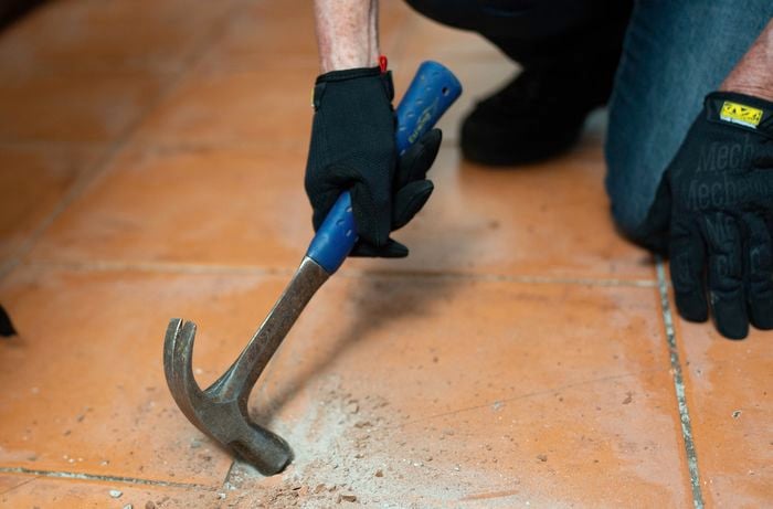 진입점으로 느슨하거나 손상된 타일을 찾으십시오. 느슨한 타일이 없으면 망치를 사용하여 중앙에 있는 타일 하나를 부수고 시작할 수 있는 위치를 제공합니다.