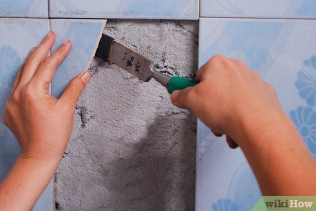 오래된 타일을 완전히 제거하십시오. 주변 타일이 손상되지 않도록 주의하십시오.[3]- 석조 비트가 있는 전기 드릴을 사용하여 금이 간 타일에 대각선 일련의 작은 구멍을 뚫고 뚫은 구멍의 간격을 1인치(2.54cm) 미만으로 유지합니다.